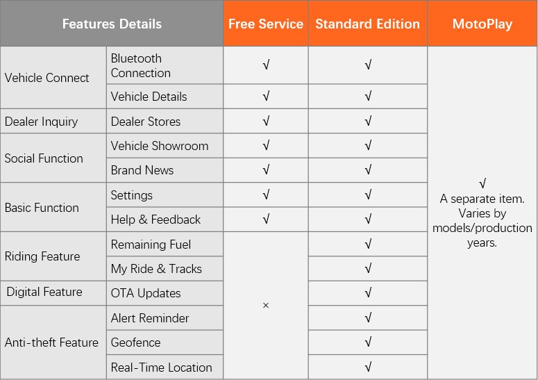 • Standard Edition (e.g., real-time location, my ride, historical tracks, E-manual etc.)